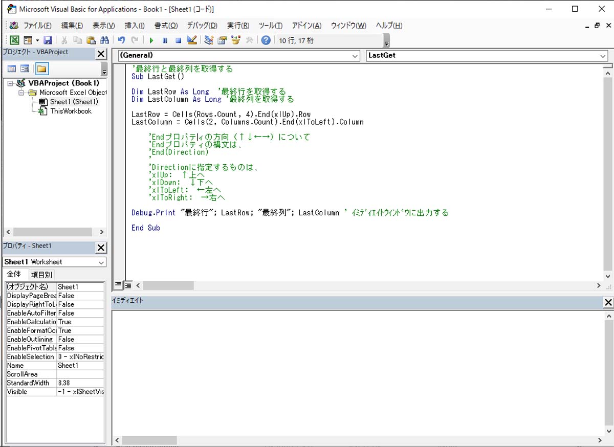 Debug.Print “最終行”; LastRow; “最終列”; LastColumn ‘ イミディエイトウィンドウに出力する